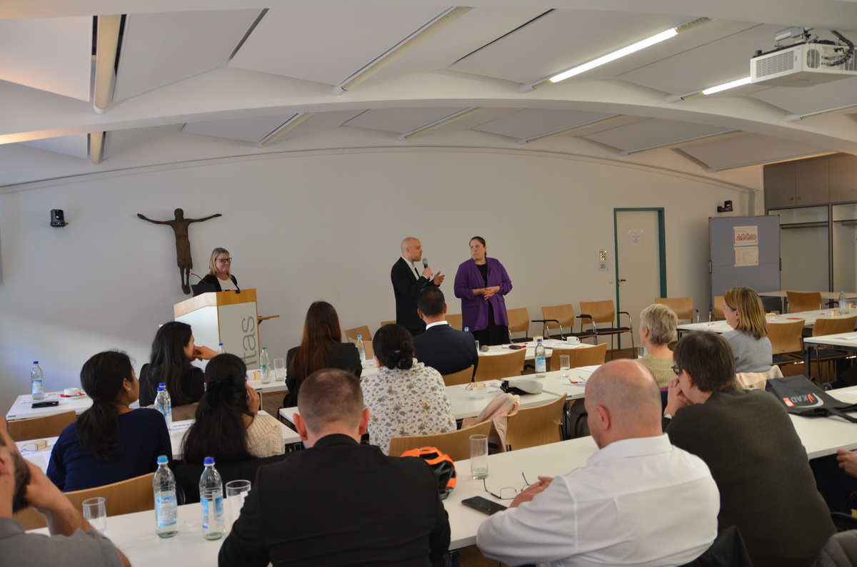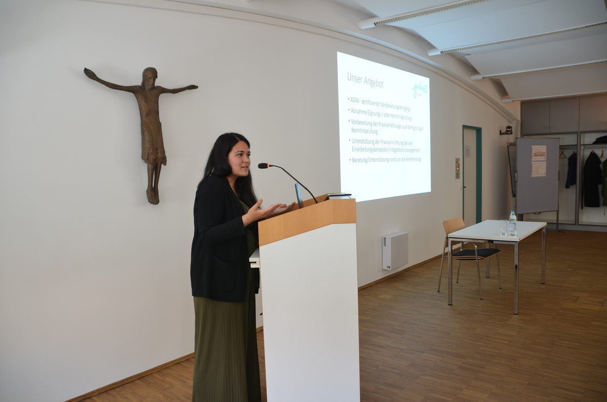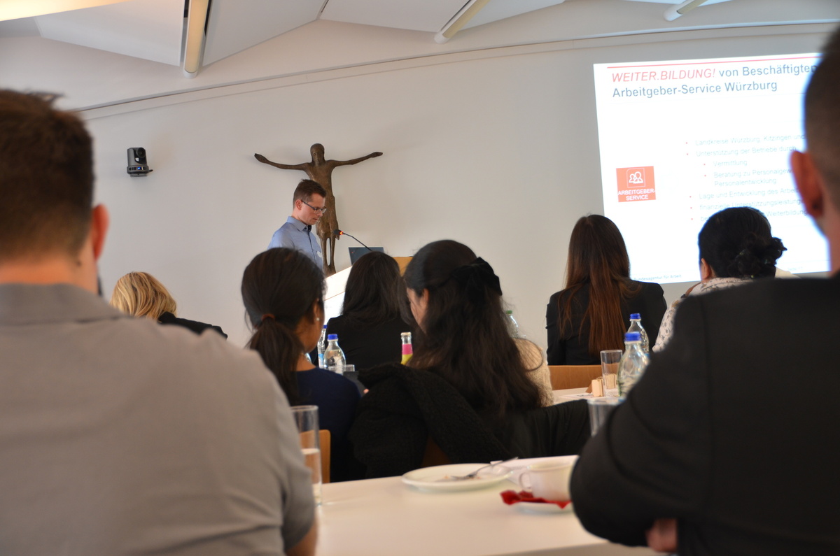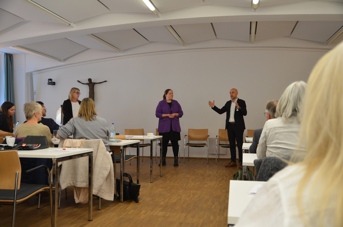 Für den Fachtag hatte das Organisationsteam mehrere Referenten eingeladen, die zu unterschiedlichen Themen aufklärten und Informationen an die Zuhörerinnen und Zuhörer im Seminarraum weitergaben. So gab Prof. Dr. Lukas Slotala von der Technischen-Hochschule Würzburg Schweinfurt (THWS) Einblicke in den Gesamtprozess, den Arbeitgebende bei der Anwerbung und Integration von internationalen Pflegekräften berücksichtigen sollten. Er machte der interessierten Zuhörerschaft Mut, vor der hohen Dynamik der Sache und den weiteren Herausforderungen wie möglichen Schnittstellenproblematiken oder Problemen beim Anerkennungsprozesse nicht zu resignieren: „Bei dem Thema hat sich in den letzten Jahren viel getan.“ So seien beispielsweise die erforderlichen Gesetze besser denn je, sagte der Wissenschaftler. Trotzdem sei das A und O, die gute Integration von neuen, ausländischen Mitarbeitenden in die Stammbelegschaft. Nur so könne ein solches Vorhaben nachhaltig gelingen.