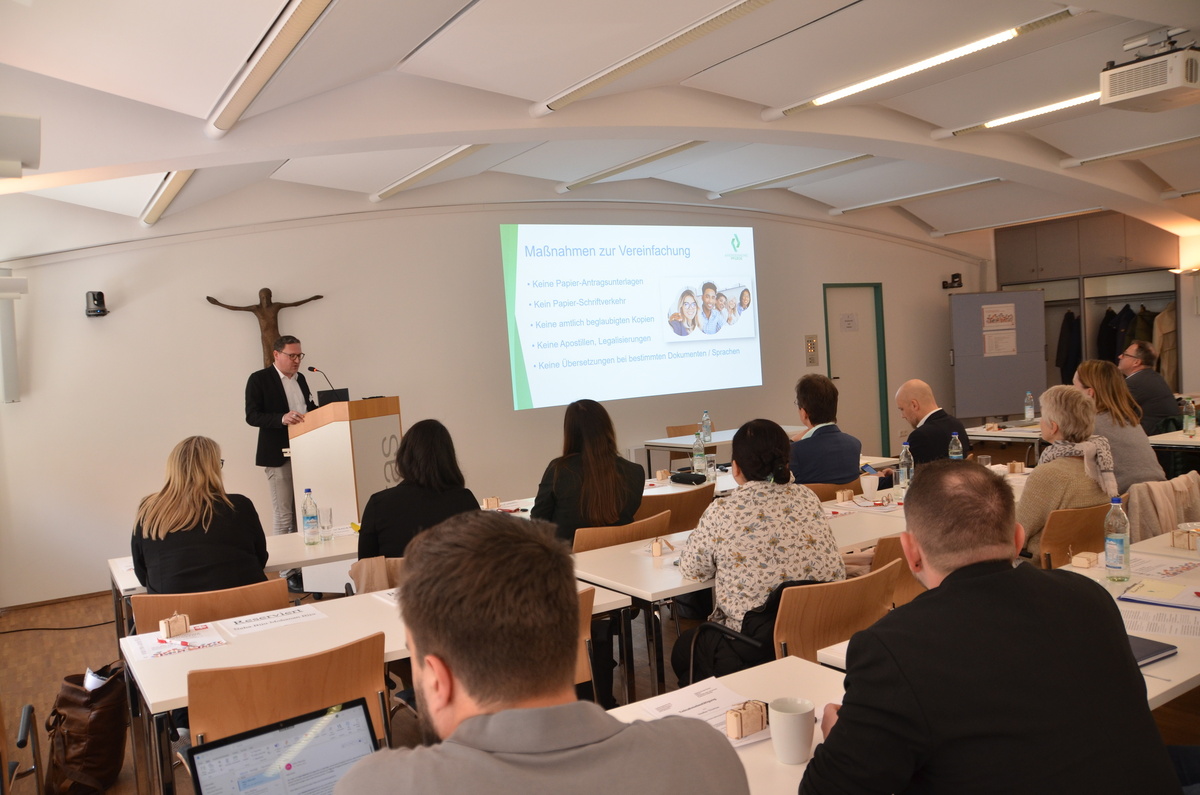 Das beschleunigte Fachkräfteverfahren „Fast Lane Bayern“, die rechtlichen Rahmenbedingungen für die Anwerbung und Integration von internationalen Mitarbeitenden sowie das Anerkennungsverfahren stellten Klaus Speckner, Leiter „Zentrale Stelle für Einwanderung von Fachkräften ZSEF beim Bayerischen Landesamt für Pflege (LfP) sowie sein Kollege Dr. Andreas Bschleipfer, Leiter des Referats „Sachbearbeitung und Gleichwertigkeitsprüfung“, vor. Mit der Einführung von „Fast Lane“ sei eine Zentralisierung der Prozesse und damit eine Verkürzung der Bearbeitungsdauer eingetreten. „Unsere Initiativen tragen bereits erste Früchte“, erklärte Speckner. Bei allen Fragen stehe das LfP als Ansprechpartner für Arbeitgeberinnen und Arbeitgeber gerne zur Verfügung.