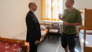 Männer, die dringend ein Dach überm Kopf und ein Bett brauchen, finden in der Wallgasse die KZÜ, die Kurzzeitübernachtung. Einrichtungsleiter Michael Thiergärtner führte durchs Haus, schilderte einen typischen Arbeitstag und stellte auch die Zentrale Beratungsstelle für Wohnungslose und das Betreute Wohnen vor. „Die Suche nach Wohnraum, der auch bezahlbar ist, stellt uns zunehmend vor Herausforderungen“, sagte Thiergärtner. Wohnraum werde deshalb dringend benötigt, weil alle Angebote der Christophorus-Gesellschaft zeitlich begrenzt sind. „Wir bieten den Männern hier schnelle Hilfe an, wollen aber auch schauen, wie es gut weitergehen kann.“ Bischof Jung zeigte sich äußerst interessiert an der sozialpädagogischen Arbeit und würdigte sie als einen echten Beitrag zum sozialen Frieden. „Wir arbeiten hier für die Menschen in enger Vernetzung mit anderen Diensten und Einrichtungen“, so Fiedler. Auch hier spielten Caritas und Diakonie eine zentrale Rolle.
