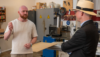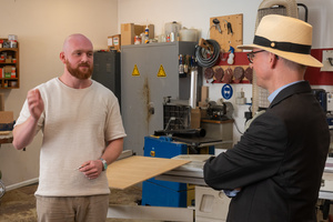Tagesstruktur mit Beschäftigungsmöglichkeiten bietet das Johann-Weber-Haus als stationäre Einrichtung am Haugerring. Hier können Männer bis zu 18 Monate wohnen. Leiter Johannes Kopf führte den Bischof zunächst in die Holzwerkstatt. „Das ist für unsere Leute ein guter Lernort. Mit viel Zeit und fachkundiger Betreuung durch Schreinermeister Stefan Nothegger werden hier alte Möbel restauriert.“ Es gehe um Pünktlichkeit und Zuverlässigkeit, um das Selbstwertgefühl und soziale Gemeinschaft. Ziel aller Maßnahmen sei es, die Menschen in ein eigenständiges Leben zu begleiten. Die Arbeit sei sinnvoll und gut, koste aber viel Geduld und Zeit.