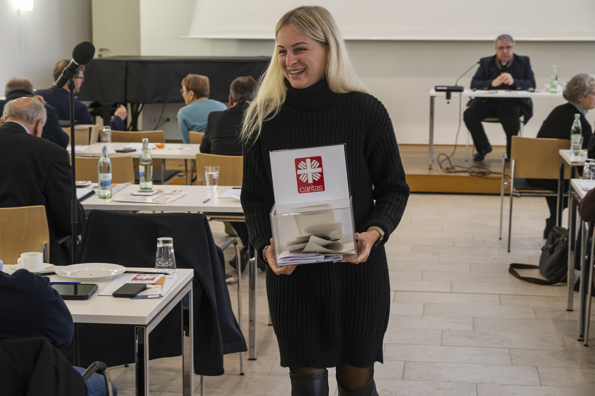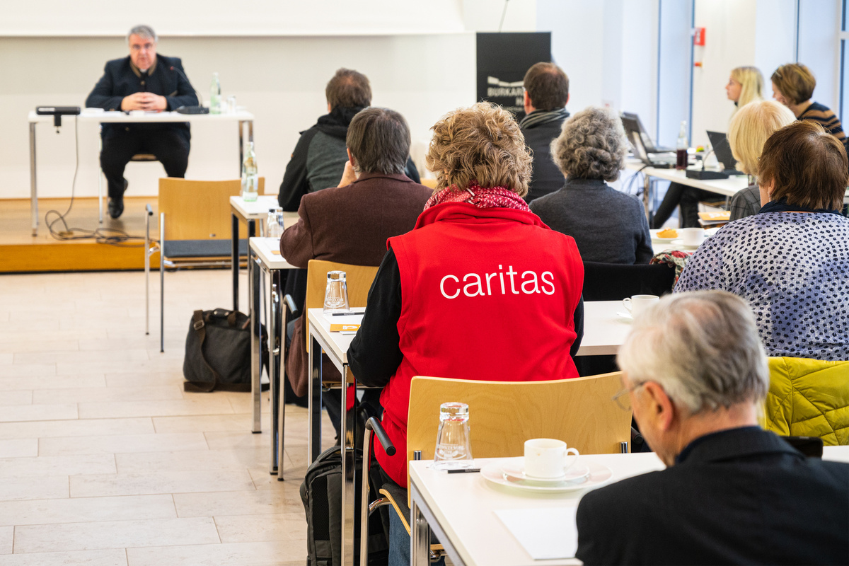 „Wir sind dankbar über die Entscheidung unserer Diözese, zwei Millionen Euro, die uns aus der Energiepauschale und der damit verbundenen Kirchensteuer unverhofft zukommen werden, über die Caritas an Bedürftige weitergeben zu können“, leitete Domkapitular Bieber zum nächsten Tagesordnungspunkt über. Referent Kilian Bundschuh stellte das Konzept vor, das über drei Säulen für Nachhaltigkeit und Fairness sorgen soll. „Wir unterstützen ab Januar notleidende Menschen direkt; wir erweitern das Beratungsangebot in der Diözese für vorerst zwei Jahre; wir fördern entsprechende Projekte in den pastoralen Räumen“, so Bundschuh. Bundschuh stellte klar, dass die Caritas unbürokratisch helfen werde und zugleich verhindern müsse, zur Lückenbüßerin für ausbleibende staatliche Leistungen zu werden. „Damit es fair zugeht, werden wir nicht mit der Gießkanne Geld verteilen, sondern genau hinschauen.“ Zugleich betonte der Fachmann der Caritas, dass Geld allein oftmals keine ausreichende Unterstützung biete. „Wir brauchen, mehr denn je, gute Beratung.“ Öffnungszeiten würden – zunächst für zwei Jahre – ausgedehnt, um der wachsenden Nachfrage entsprechen zu können. Gleichzeitig lud Bundschuh Pfarreien ein, mit Projekten vor Ort zu helfen. „Wir werden uns das anschauen, und dort unterstützen, wo es zum Beispiel um Wärme für arme Menschen und Gemeinschaft für Einsame geht.“
