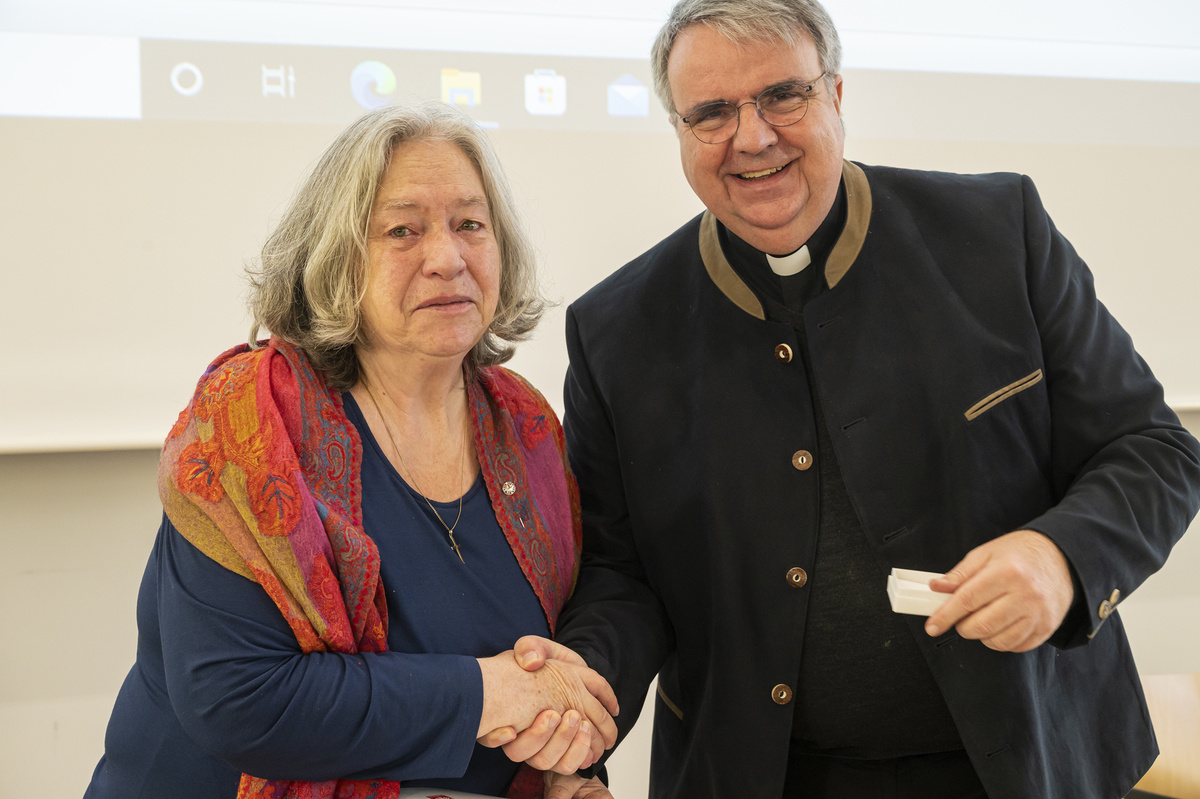 Überrascht und sichtlich gerührt zeigte sich Lucia Stamm, der Domkapitular Bieber das Caritaskreuz in Silber überreichte. Sie habe sich große Verdienste um die Caritas im Bistum Würzburg erworben, heißt es in der Urkunde des Deutschen Caritasverbandes, die Bieber verlas. „Wir sind Dir zu Dank verpflichtet, denn zum Einen hast Du bei der Arbeit im Diözesanrat der Katholiken stets die Caritas im Blick gehabt, zum Anderen bist Du eine Verfechterin für das Anliegen unseres Bischofs, die Caritas pastoraler und die Pastoral caritativer zu gestalten und beide besser miteinander zu vernetzen“, so Bieber in einer kurzen Laudatio. „Durch Deine kommunikative und verbindende Art hast Du wesentlich dazu beigetragen, dass Caritasverband und Diözesanrat einander nähergekommen und in vielen Punkten zusammenarbeiten. Nach Jahren engagierter Mitarbeit verlässt Lucia Stamm die Vertreterversammlung der Caritas. Ihre Nachfolgerin, auch im Amt der stellvertretenden Vorsitzenden des Diözesanrates, Anja Mantel wurde mit Applaus und einem kleinen Bronzerelief „Der Sämann“ des Künstlers Egino Weinert herzlich begrüßt.