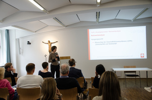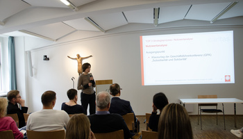 Dass die Themen institutionelles Schutzkonzept der Geschäftsstelle und die UKAM-Studie, die kürzlich für das Bistum Würzburg veröffentlicht wurde, im Caritashaus und der Diözese einen hohen Stellenwert einnehmen, machte Florian Fell, Mitarbeiter in der Stabstelle Prävention und Intervention im DiCV, mit seinem Kurzvortrag zu diesen beiden Themen deutlich. So sei die Veröffentlichung der UKAM-Studie ein wichtiges Signal für die Aufarbeitung im Bistum und in der katholischen Kirche von Würzburg. Ziel sei es, für alle eine sichere und vertrauensvolle Umgebung in der Kirche zu schaffen, so Fell abschließend.