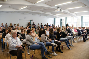 Nachdem gestern Nachmittag die diesjährige Wahl der Mitarbeitervertretung (MAV) beendet und die Stimmen durch den Wahlausschuss um Martina König, Tabea Müller und Maria Wallrapp ausgezählt worden waren, stellte Tabea Müller die Wahlergebnisse als ersten spannenden Punkt auf einer langen Liste von Tagesordnungspunkten, die im Rahmen der Personalversammlung noch folgen sollten, vor. Nicht, ohne sich jedoch zunächst bei den Kandidaten und Kandidatinnen, die sich zur Wahl gestellt hatten, und bei den Kolleginnen und Kollegen für die hohe Wahlbeteiligung von 81 Prozent zu bedanken.